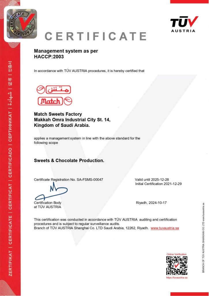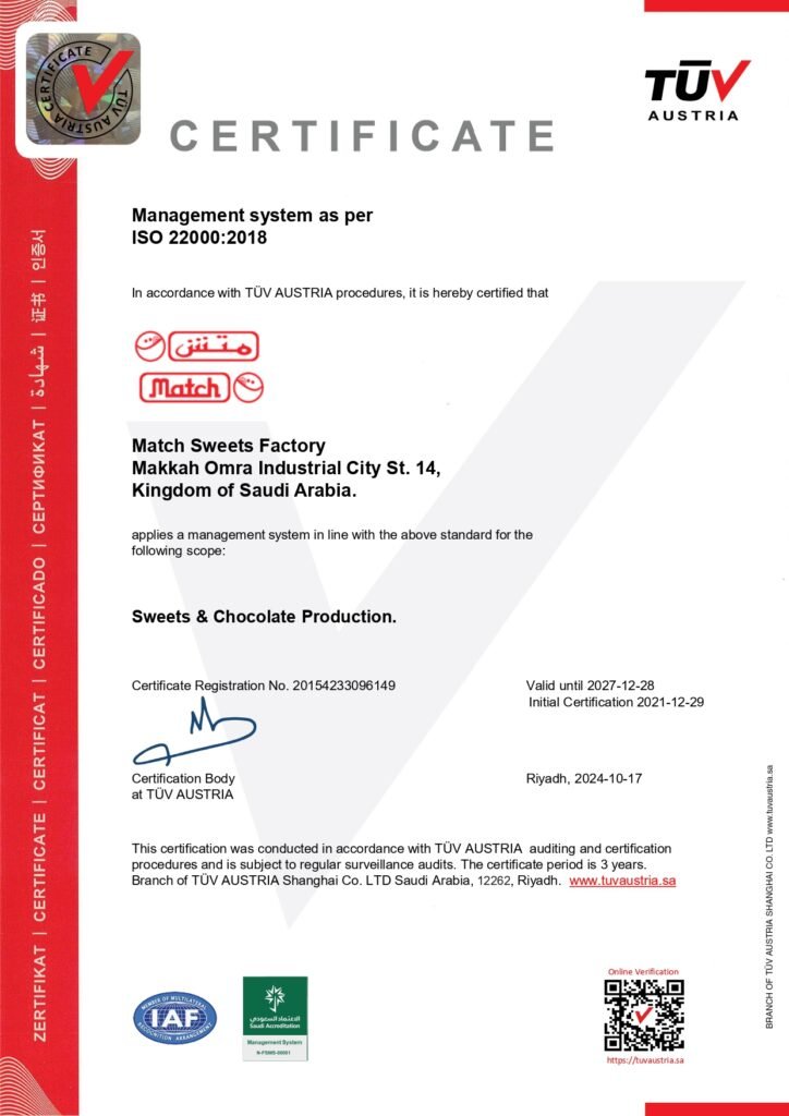 Affirming its commitment to global quality standards, Match Sweets Factory has earned: